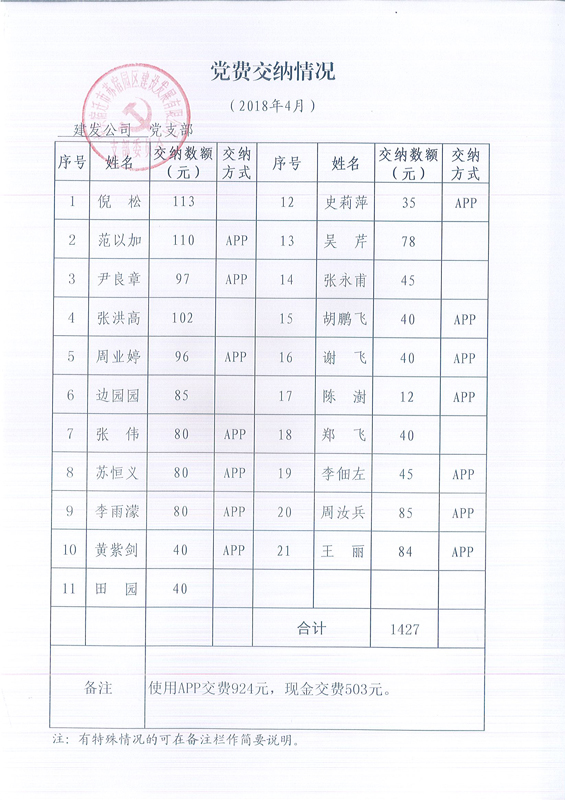 建發(fā)公司黨支部2018年4月份黨費(fèi)交納公示