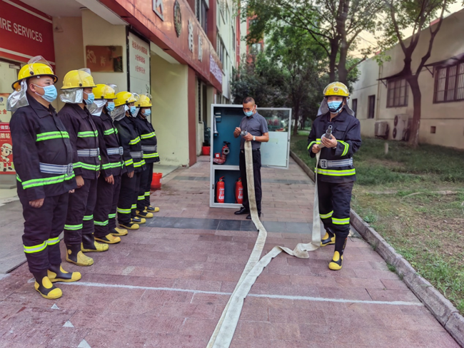 “立正,向右看齊,向前看 ?!?9月1日,園區(qū)公舍微型消防站,建發(fā)公司正在開展應急救援集訓,訓練場上身穿著消防服的“消防員們”個個精神飽滿、斗志昂揚。