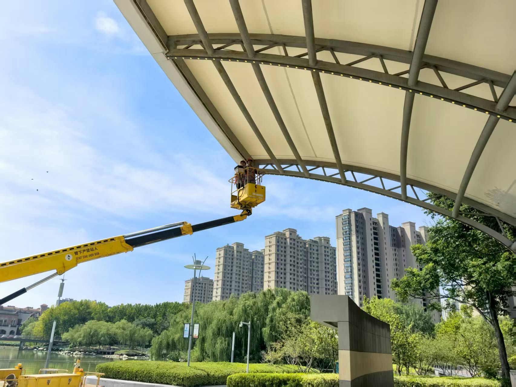 “今天在蘇州公園大舞臺進(jìn)行登高作業(yè),維修頂部燈光。注意作業(yè)平臺與頂棚保持安全距離……”8月20日上午9點(diǎn),夏日驕陽似火,蘇州公園作業(yè)現(xiàn)場氣溫已接近37℃。園區(qū)機(jī)電維護(hù)項(xiàng)目部技術(shù)負(fù)責(zé)人沈剛強(qiáng)和同事們開始了當(dāng)天的第一場高空維修。