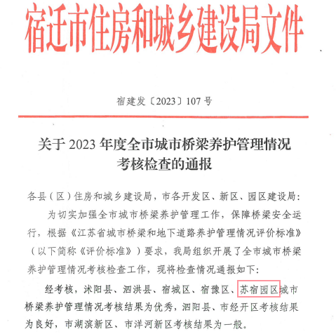 近日,宿遷市住房和城鄉(xiāng)建設(shè)局下發(fā)2023年度全市城市橋梁養(yǎng)護(hù)管理情況考核檢查通報(bào),園區(qū)城市橋梁養(yǎng)護(hù)管理工作再獲佳績。